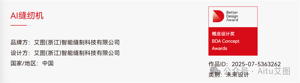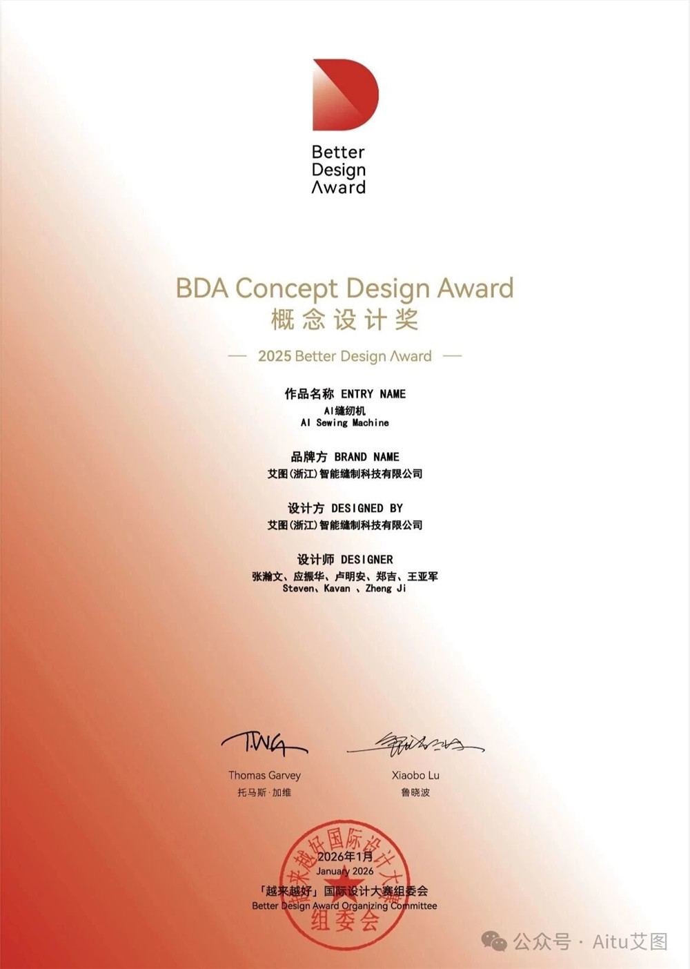Aitu's AI Sewing Machine Ai10 has been honored with the Conceptual Design Award at the 2025 "Better Design Award" international design competition, in recognition of its outstanding core product quality and innovative technology. The competition is organized under the guidance of China Media Group and the municipal governments of Guangdong Province, Guangzhou City, and Shenzhen City. Focusing on the modern industrial system and new quality productive forces, it is dedicated to building a world-class exchange platform for Chinese design.